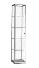 De kast is opgebouwd uit een stevig aluminium profiel in combinatie met helder ESG-veiligheidsglas voor optimale stabiliteit en maximale zichtbaarheid. De vier legborden van floatglas zijn traploos in hoogte verstelbaar, zodat de indeling eenvoudig kan worden aangepast aan verschillende productformaten. De bodem is uitgevoerd in plaatmateriaal in dezelfde kleur als het profiel, wat zorgt voor een harmonieus geheel. Dankzij de stelvoeten staat de vitrine altijd stabiel, ook op oneffen vloeren. Optioneel is de vitrine leverbaar met plafondverlichting voor een nog betere productpresentatie.